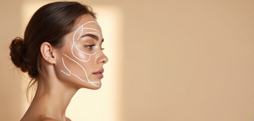 Young woman face with white lifting marks. Prepares for aesthetic medicine treatment, facial contouring, cosmetic procedure. Profile view on light background suggests beauty care, skin rejuvenation,