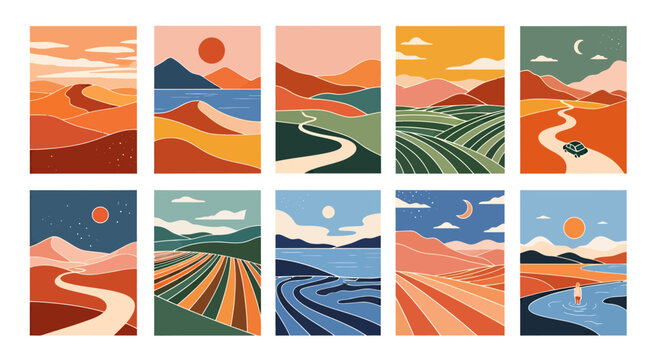 A collection of minimalist vector landscape illustrations showcasing diverse natural scenes, from deserts and seascapes to agricultural fields, rendered in a modern, artistic style.