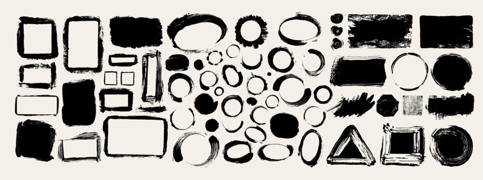 Vector hand drawn ink design elements. Sponge stamps, dry brush marks, splatter sprinkles, pastel pencil textures. Set of grunge black artistic brushstroke design elements isolated on white background