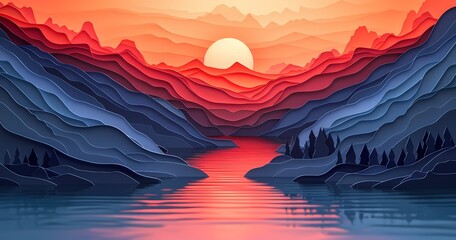A tranquil masterpiece of nature's watercolor, the river flows gracefully through the majestic mountain range as the sunrise paints the sky with hues of gold and pink