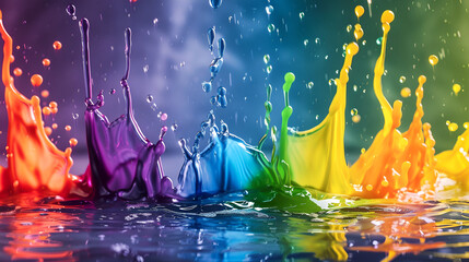 Vibrant color splash with reflective water drops, a dynamic dance of hues.