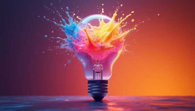 A lightbulb bursts open, releasing a vibrant explosion of colorful liquid against a gradient background. The image represents creativity and innovation.