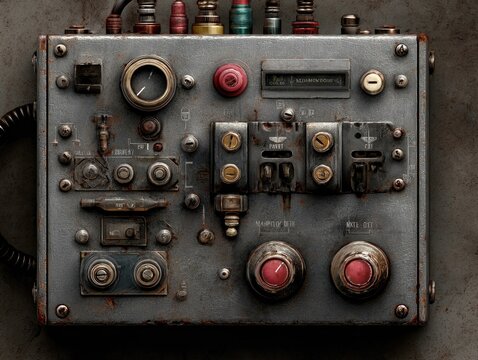 A weathered, metallic control panel, featuring numerous dials, switches, gauges, and buttons in varying states of rust and disrepair.  The panel exhibits a vintage, industrial aesthetic