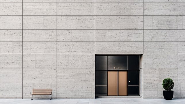 Minimalist bank facade with smooth stone walls, frameless glass panels, and simple metallic signage, Modernist, neutral palette, crisp focus