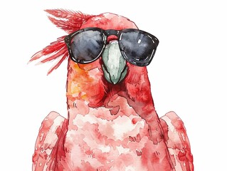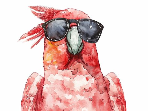 A brightly colored parrot wearing sunglasses. Fashionable and stylish bird drawn in the style of children's watercolor drawing. Illustration for cover, card, postcard, interior design, decor or print.