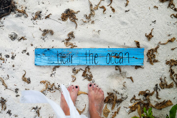 "Hear the Ocean" Wooden Sign and Bare Feet