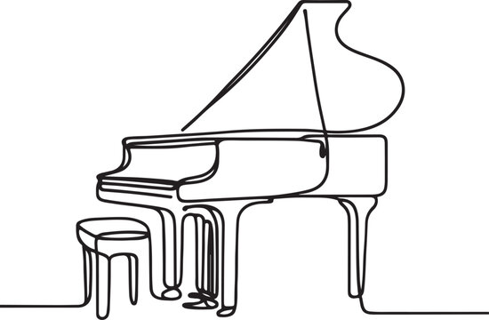 Continuous line drawing of a grand piano, saxophone, and violin. Minimalist music instruments illustration, elegant linear style, simple black outlines on white background, modern artistic design.