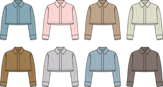 Set of eight cropped shirt designs in various colors, presented as flat fashion illustrations