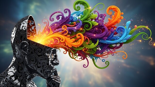 A creative concept visualizes a person with an open head, thoughts as colorful explosion. Unleashing of ideas and imagination with artistic inspiration.