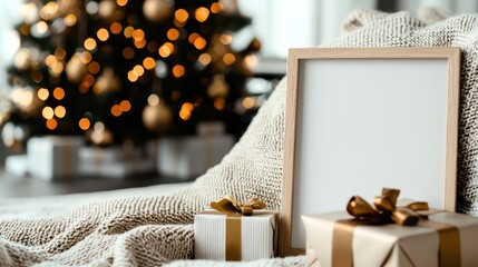An empty photo frame surrounded by elegantly wrapped Christmas presents close to a beautifully decorated tree, symbolizing celebration and creativity.