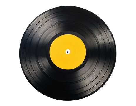 High resolution isolated photo of a classic vinyl record featuring a glossy black surface and label