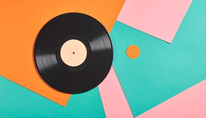 Black vinyl record with beige label on vibrant geometric background of orange, pink, and teal.