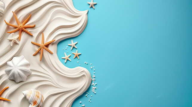 top view flat lay sea foam, stars, shells on blue background with copy space for Happy Ferragosto day.