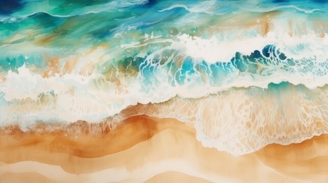 Summer background in watercolor style sea wave and sand beach. AI generative.