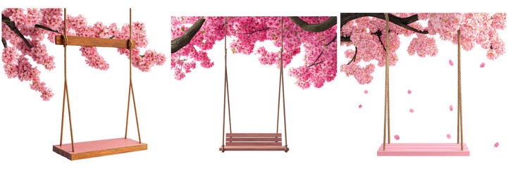 Serene Spring: Wooden Swing Beneath Blossoming Cherry Trees at Golden Hour