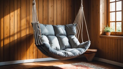 Cozy indoor hammock swing chair against a warm wooden wall creating a relaxing space perfect for leisure and tranquility in home decor.