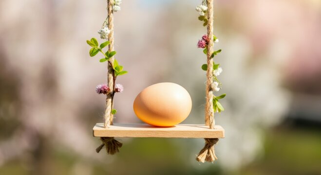 Easter egg on wooden swing with flower garland in sunny spring garden