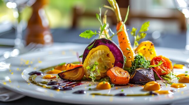 a stunningly plated dish of roasted vegetables with vibrant colors and artistic presentation, looking like a painting