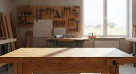A bright woodworking shop featuring a wooden workbench and a tool rack on the wall near a window