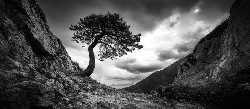Lonely Curved Tree In A Mountain Gorge Black And White Photography Wide Angle Dramatic Sky Over Tree