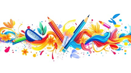 A school banner designed for a September event, featuring bright and colorful school supplies arranged artistically on a white background.