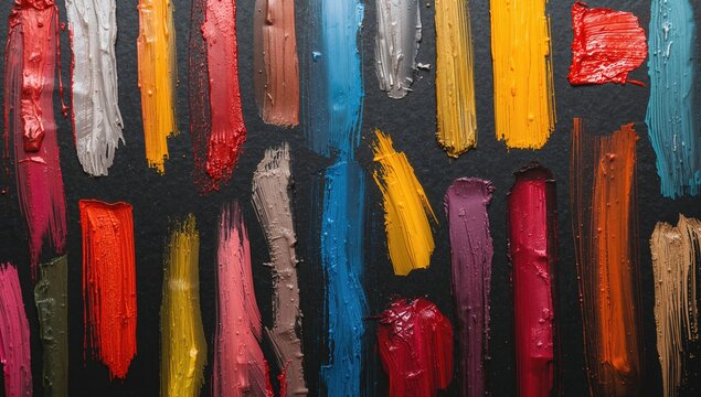 Vibrant multicolored paint strokes arranged artistically on a dark background, suitable for editorial design