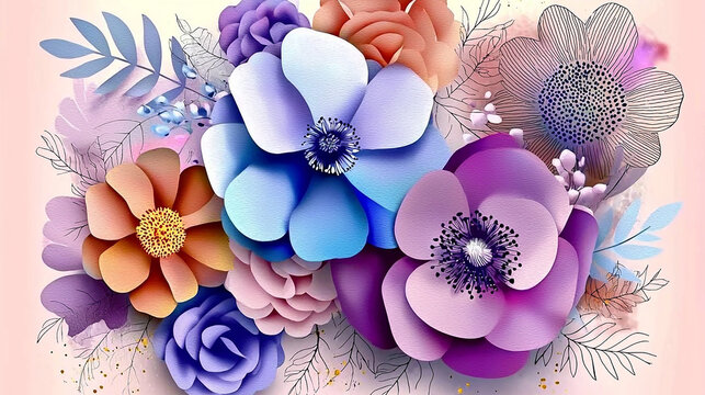 Vibrant 3D Paper Flowers with Artistic Floral Illustration