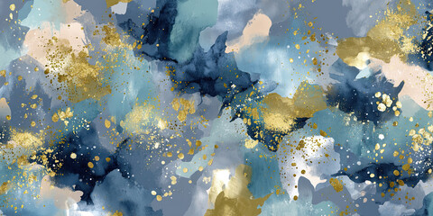 Abstract blue gold watercolor texture with splashes