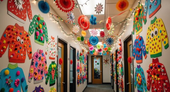 Festive office decor for ugly sweater day celebration with colorful sweaters and ornaments
