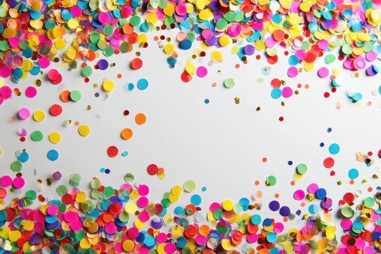 Colorful confetti scattered on a white background, creating a festive atmosphere for celebrations and events