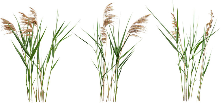 Cut out plant. Reed grass. Isolated cattail and reed plants on a white background. Cutout bulrush and distaff. High-quality clipping mask for professional compositions.