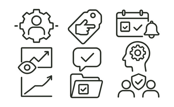 Line style icons of initiative and responsibility: self-starter badge, own your action tag, complete the task file, check-in before reminder board, look ahead chart, do what’s needed bubble,