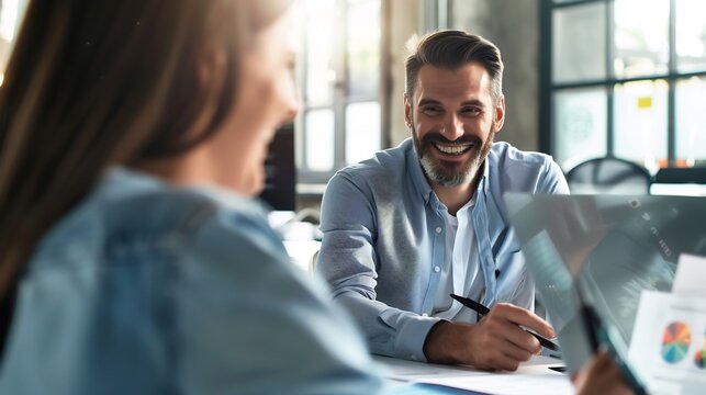 Smiling businessman analyzing sales data sales director a vibrant office environment The focus is on performance metrics and the strategies needed to drive revenue growth and achieve business targets