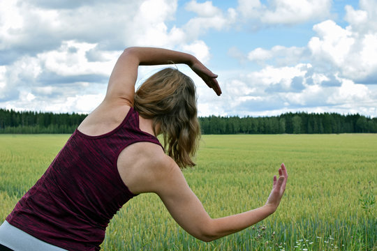 Middle aged yoga woman stretching and exercise outdoors. Rear view, field on background.