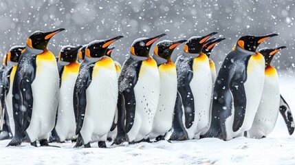 King Penguin parade walking on snow at Asahiyama Zoo in winter season. landmark and popular for tourists attractions in Asahikawa, Hokkaido, Japan. Travel and Vacation concept