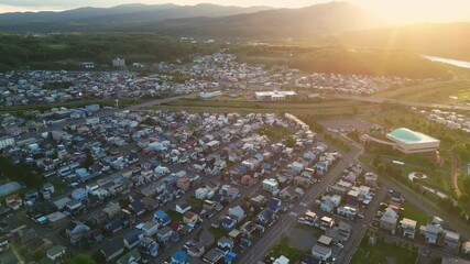 Asahikawa, Japan: Aerial drone footage of the sunset over a residential districts with many detached houses in Asahikawa in Hokkaido in northern Japan