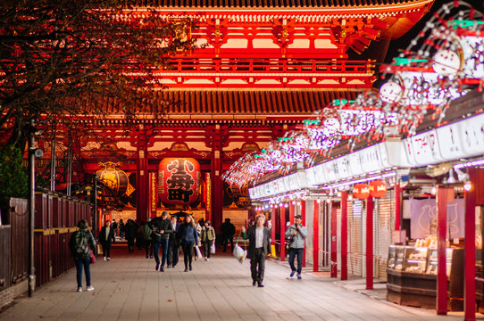 Nakamise-dori shopping street at Senso-ji Temple in Tokyo, Japan. Senso-ji is an ancient Buddhist temple located in Asakusa, Tokyo, Japan.