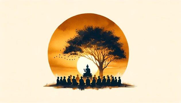 Watercolor illustration for asalha puja with a  scene of a silhouette of the buddha and monks.