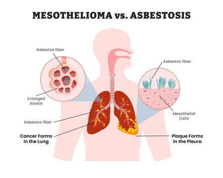 Mesothelioma Lung vs Asbestosis Lung, educational medical poster design healthcare scheme, human lung disease internal organs. Labeled plaque forms in pleura, asbestosis fiber.