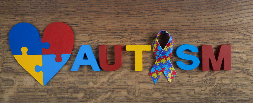 Autism awareness. Autism awareness ribbon, heart and word autism on wooden background background.