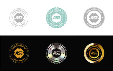 Engine Verified by ASE Certified Mechanics icon, stamp, seal, symbol and logo in minimal, gold, silver design vector
