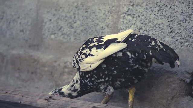 Slow motion 4K footage of aseel rooster is cleaning its feathers. A rooster is cleaning itself with its feathers. A beautiful big rooster and hens cleaning their feathers. Wing cleaning scene.