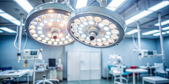 Sterile surgical tools arranged on blue drape before procedure in operating room