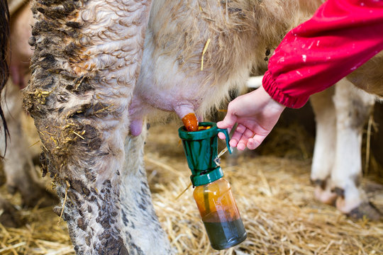 Closeup iodine brilliant green on cow udder for disinfection and health care vs mastitis.