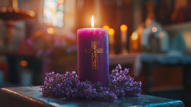 Purple candle with a cross and lavender flowers on the altar during Ash Wednesday service in a church