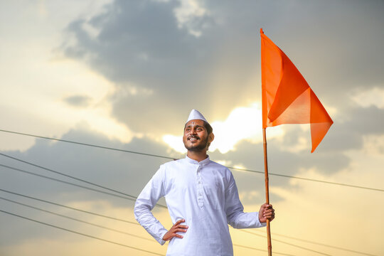 Young indian man (pilgrim) in traditional wear and waving religious flag.