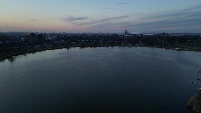 flying over meadow lake towards arthur ashe stadium, world's fair site pavilion observation towers in corona flushing meadows park (new york city tennis center at dusk, sunset) dark night drone shot