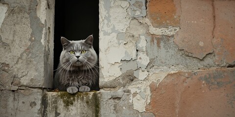 An ashen mustachioed cat with a stern expression perched in a window opening of a traditional house, urban wildlife