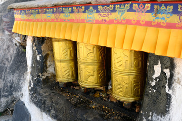 Three golden prayer wheels sit motionless at Deprung Monastery in Tibet.