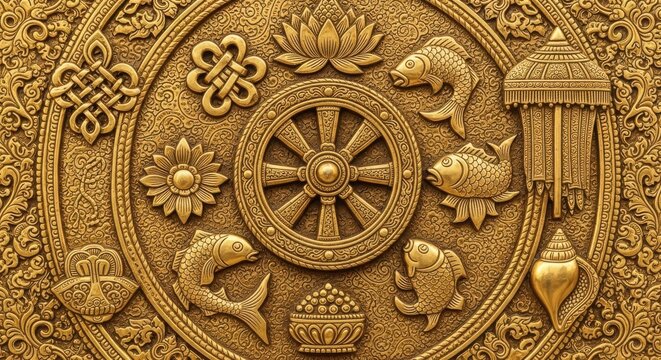 Golden Buddhism Eight Auspicious Symbols Ashtamangala Background for Meditation and Harmony